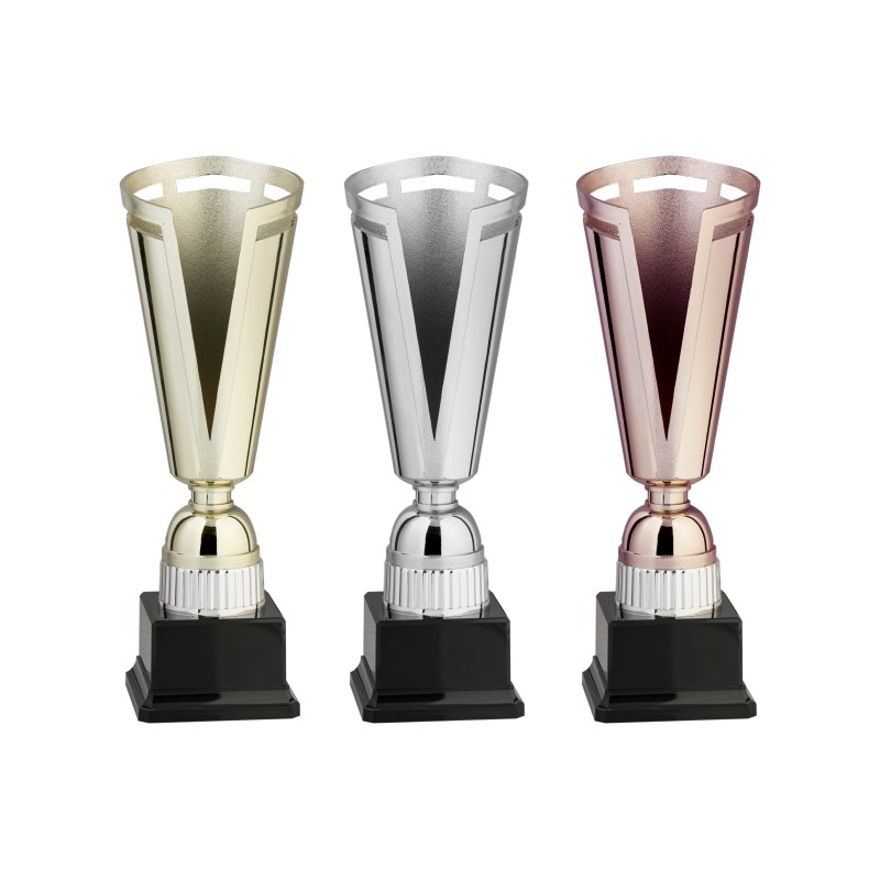 Additional informationTrofeo con tazza simil taglio laser sobrio con apertura a “V” sul fronte. Si contraddistingue per la sua particolare variazione di colori oro, argento e bronzo nelle tre versioni disponibili