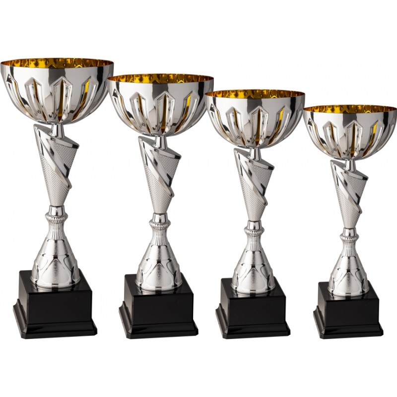 Tazza in metallo, gambo in plastica, base in plastica e resina - colore Argento - Coppa con tazza in metallo bicolore, con piccole asole romboidali esaltate proprio dalla speciale lavorazione e dal colore dorate interno che crea un particolare contrasto con l'argento esterno, prodotto altamente innovativo e nuovissimo - Nel catalogo a pagina 8A