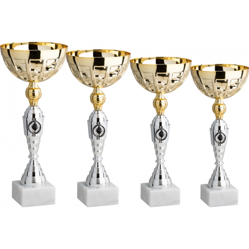 Tazza in metallo, gambo in plastica, base in marmo - colore Oro - Coppa caratterizzata da gambo bicolore oro argento con alloro, la tazza in metallo presenta lavorazioni puntinate nella parte inferiore conservando la lucidità e la semplicità della parte superiore - Nel catalogo a pagina 11B
