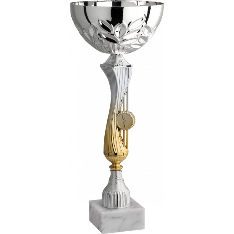 Tazza in metallo argentato, gambo in plastica argentato e dorato, base in marmo bianco carrara - colore Argento - Coppa nuova per la nostra ultima collezione con elementi in rilievo tutt'intorno alla tazza e con gambo bicolore di particolare raffinatezza ed originalità - Nel catalogo a pagina 11B
