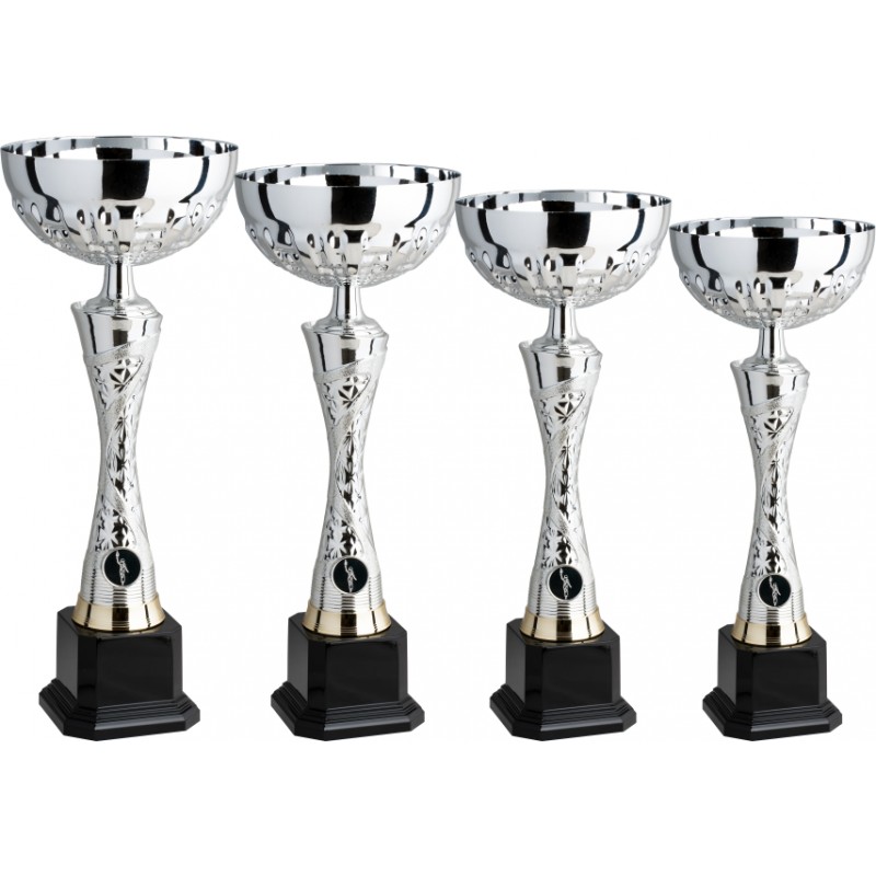Tazza in metallo argento, gambo in plastica argentato, base abs resina, colore Argento. Coppa monocolore argento, con gambo slanciato monopezzo e lavorazioni lungo tutta la lunghezza, tazza di produzione italiana dal design moderno ed innovativo adatto per premiazioni di ogni disciplina sportiva e per eventi di ogni tipo. - Nel catalogo a pagina 10A