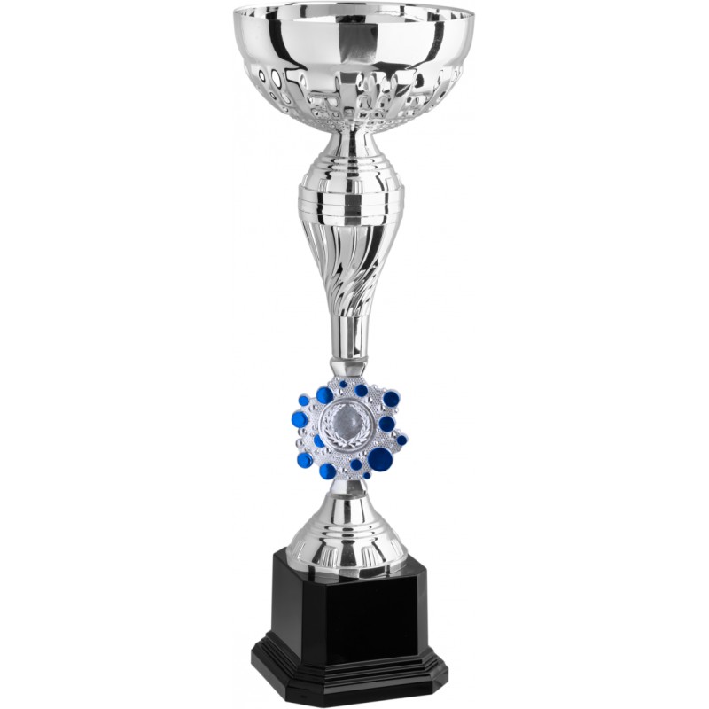 Tazza in metallo, gambo in plastica argentato con riporti in blu, base in abs e resina, colore Argento. Coppa novità, conveniente e particolarmente originale con base ottogonale. Prodotto adatto ad ogni evento sportivo e culturale, anche come premio per diffondere il proprio brand nelle manifestazione più prestigiose al fianco di partecipanti e vincitori di ogni età - Nel catalogo a pagina 10A