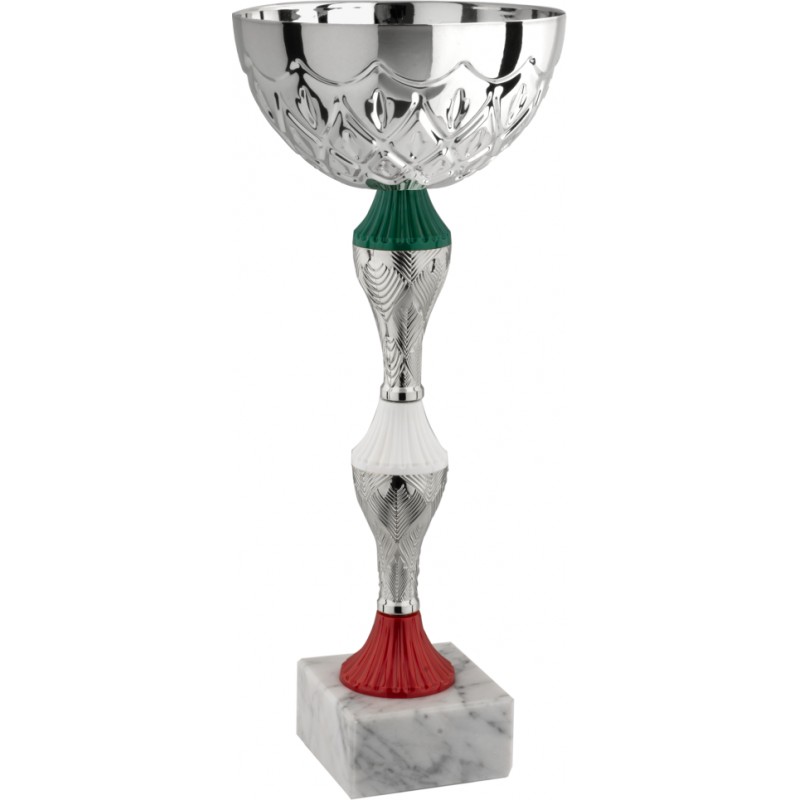 Tazza in metallo, gambo in plastica, base in marmo - colore Argento - Coppa economica con tazza dal nuovo disegno che raffigura una catena di forme geometriche uguali ricorrenti, gambo ispirato alla bandiera italiana - Nel catalogo a pagina 12B