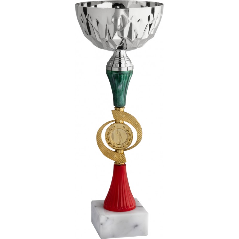 Tazza in metallo argentato, gambo in plastica verde, rosso, argentato e dorato, base in marmo bianco carrara - colore Argento - Coppa con tazza ben lavorata dove i particolari del disegno sono abbastanza evidenti e il gambo a più colori ne completa la sua posizione di prodotto economico ma alla stesso tempo unico ed originale - Nel catalogo a pagina 12