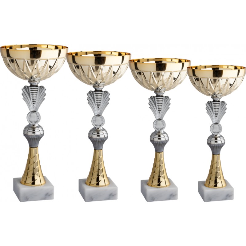 Tazza in metallo dorato, gambo in plastica argentato e dorato, base in marmo bianco carrara - colore Oro - Coppa con elementi oro-argento tutti nuovi e tazza nuova con elementi grafici evidenti e performanti. Prodotto valido sia come innovazione che come prezzo - Nel catalogo a pagina 12A