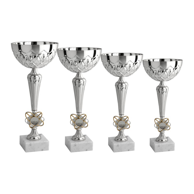 Tazza in metallo, gambo in plastica, base in marmo bianco carrara, colore Argento. Coppa moderna e conveniente, realizzata con tazza e gambo di nuovo design, caratterizzata da un elemento centrale a forma di fiore atto ad ospitare , eventualmente, un adesivo personalizzato. Il prodotto tutto metallizato è adatto per ogni tipo di gara, torneo, manifestazione o per promuovere il proprio marchio durante un evento. - Nel catalogo a pagina 13A