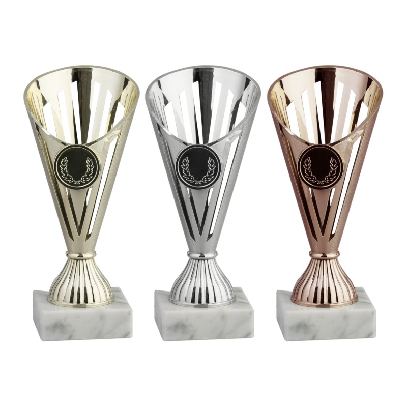 Tazza e gambo in plastica, base in marmo, colore Oro, Argento, Bronzo. Coppa piccola realizzata in tre diverse colorazioni, oro, argento e bronzo. Prodotto nato dall'estro del design italiano, molto originale e conveniente è utile per premiazioni di ogni tipologia - Nel catalogo a pagina 13