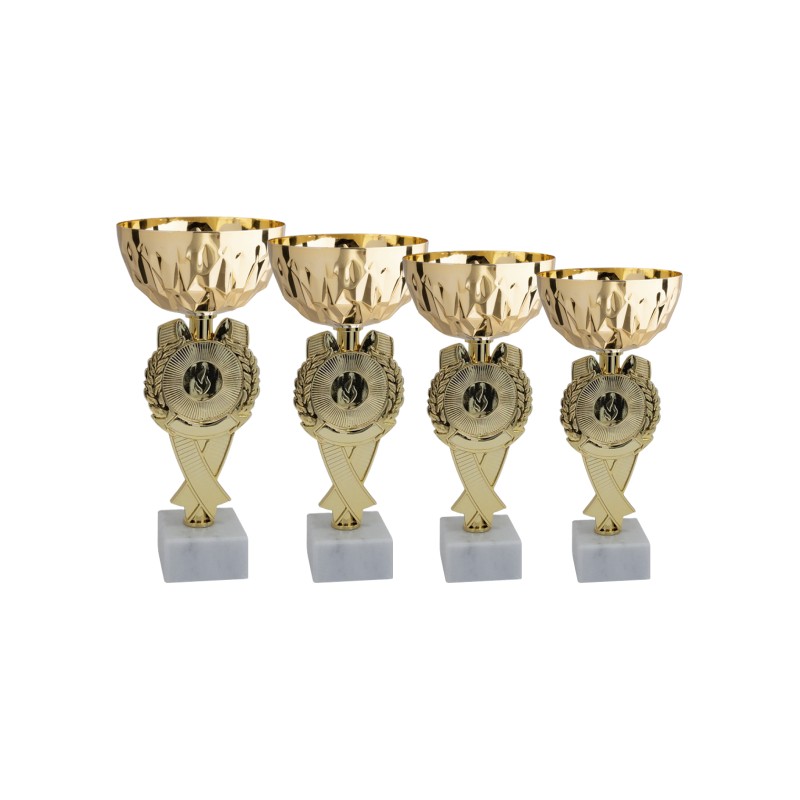 Tazza in metallo, gambo in plastica, base in marmo, colore Oro. Coppa con gambo raffigurante una coccarda che, se necessario, può ospitare un adesivo o un disco della dimensione di 25 o 50 mm. Prodotto molto conveniente e di ottima presenza, atto ad accompagnare le più qualificate cerimonie di premiazione per ogni tipo di sport, evento culturale e di rappresentanza. - Nel catalogo a pagina 13D