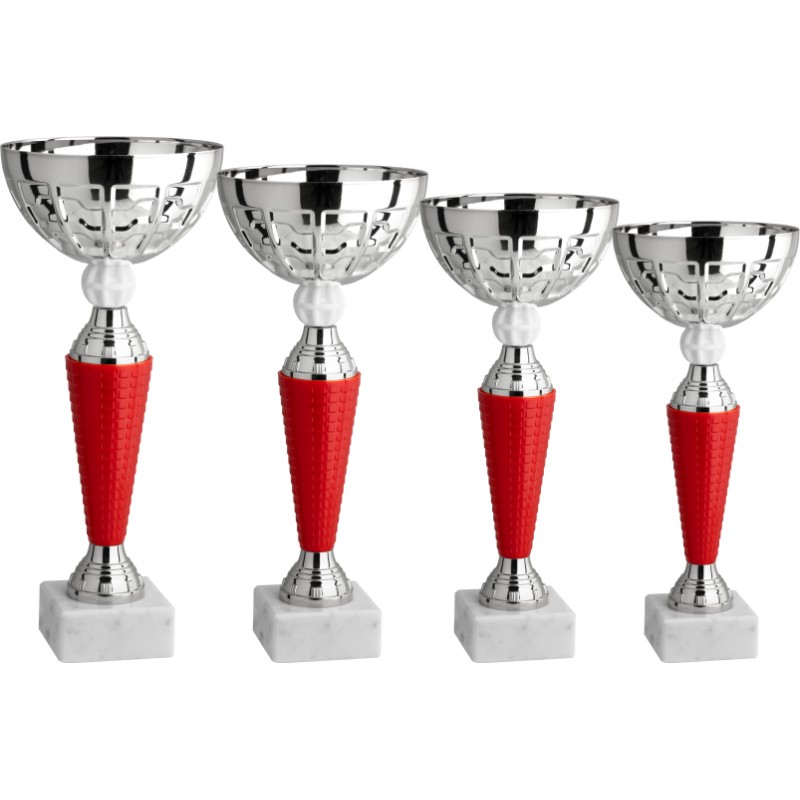 Tazza in metallo, gambo in plastica, base in marmo bianco Carrara, colore Argento. Coppa economica costruita con un gambo caratterizzato da un elemento conico rosso e un piccolo distanziale bianco, la tazza dal nuovo design è di produzione italiana - Nel catalogo a pagina 13C