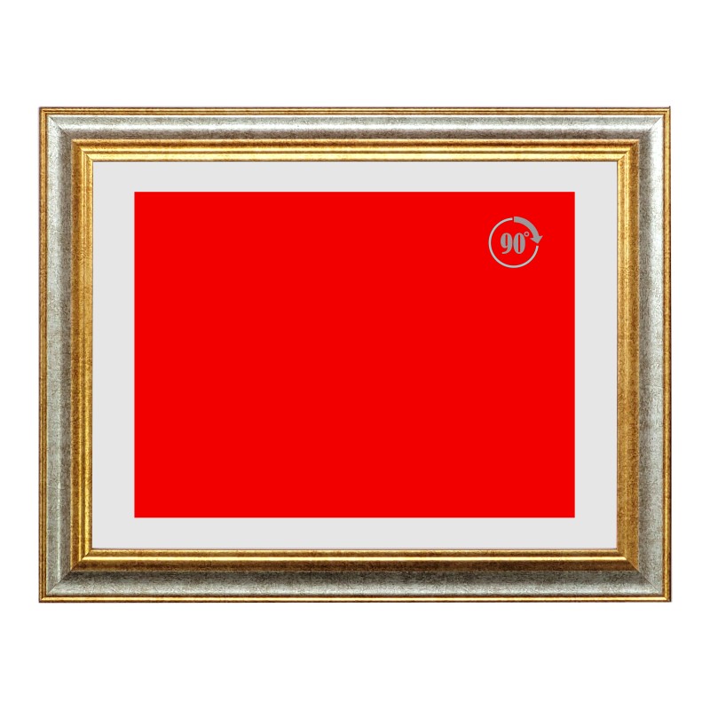 Cornice in legno dorata e argentata con passpartout cartoncino bianco cm 35x25 e cartoncino rosso cm 30x20, colore Argento. Cornice in legno fornita con cartoncino e passpartout atto ad ospitare targhe, pergamene o altro, completa di vetro spessore 2 mm, schienale in mdf, ganci in orizzontale e verticale - Nel catalogo a pagina 21, vecchio codice 21.002
