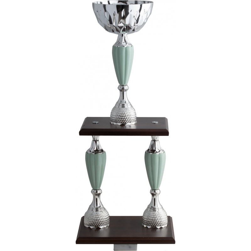 Tazza in metallo argentato, basi in legno marrone e marmo bianco carrara, gambi in plastica argentata e colorata, colore Argento. Trofeo con struttura a due basi con la speciale colorazione innovativa salvia, un tocco di novità che contraddistingue il prodotto e gli restituisce uno stile ecologico e accattivante, adatto ad accompagnare le premiazioni più prestigiose. - Nel catalogo a pagina 5A