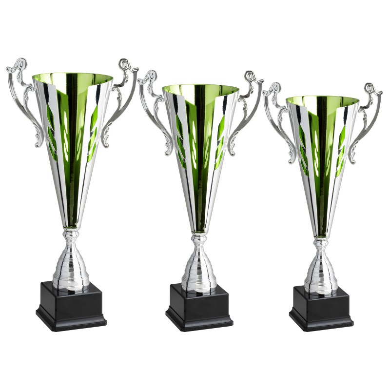 Tazza in metallo, gambo in plastica, base in plastica e resina, colore Argento. Trofeo realizzato con design moderno, taglio e traforatura laser, applicazione di manici evergreen, verniciatura interna verde moderato per esaltare i dettagli della lavorazione. Prodotto molto convenienete e di stile adatto ad ogni tipo di evento, un premio unico ed originale per i mogliori vincitori. - Nel catalogo a pagina 5A