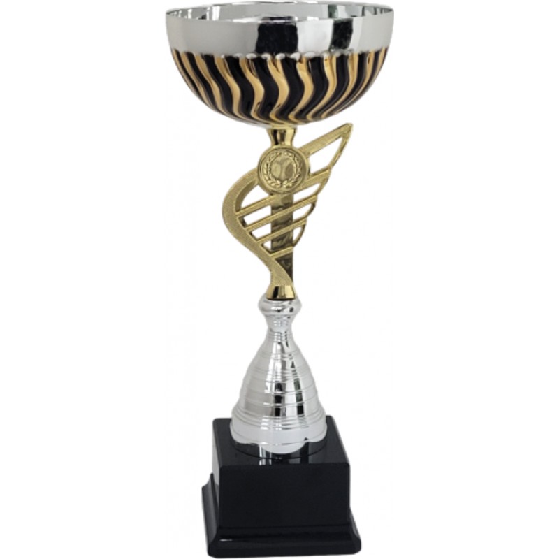 Tazza in metallo, gambo in plastica, base in plastica e resina, colore Argento. Per la collezione ultima questo prodotto economico rappresenta una bella novità, le bande oro/nero raffigurate sulla tazza argentata sono segno di eleganza ed importanza. Questo trofeo è veramente enusiasmante ed è adatto per ogni evento per dare un tocco di classe ed innovazione. - Nel catalogo a pagina 7A