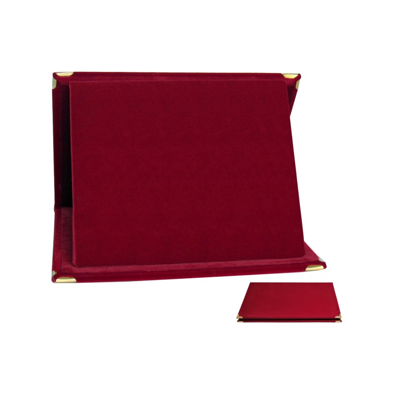 Velluto, colore Rosso. Cartella per targhe piane, apertura in orizzontale, misura interna pannello cm. 27X24. Per l'acquisto di confezioni da 10 pezzi scegliere il codice specifico. - Nel catalogo a pagina 21A, ex codice 21.251E