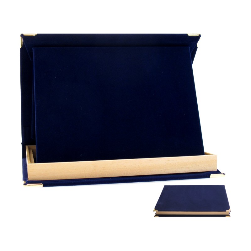Velluto e legno, colore Blu. Astuccio per targhe, apertura in orizzontale, misura interna pannello cm. 29,2x24,5 - Nel catalogo a pagina 21A, ex codice 21.201.10