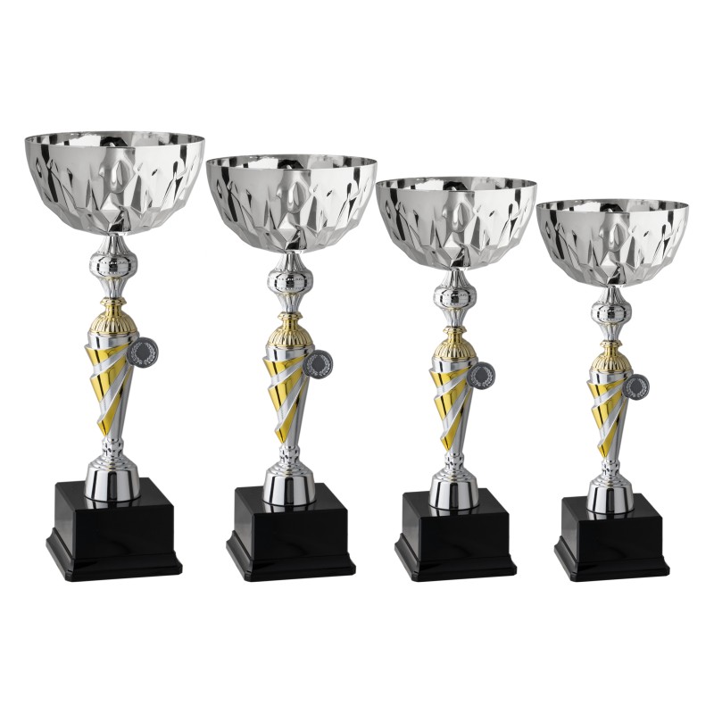 Tazza in metallo, gambo in plastica, base in plastica e resina, colore Argento. Coppa con crescenti lavorazioni in rilievo sulla tazza in metallo, componente centrale arricchito oltre dalle particolari onde bicolore, da immagine dell'alloro sulla quale è possibile inserire adesivo o disco diam. 25 mm - Nel catalogo a pagina 9A
