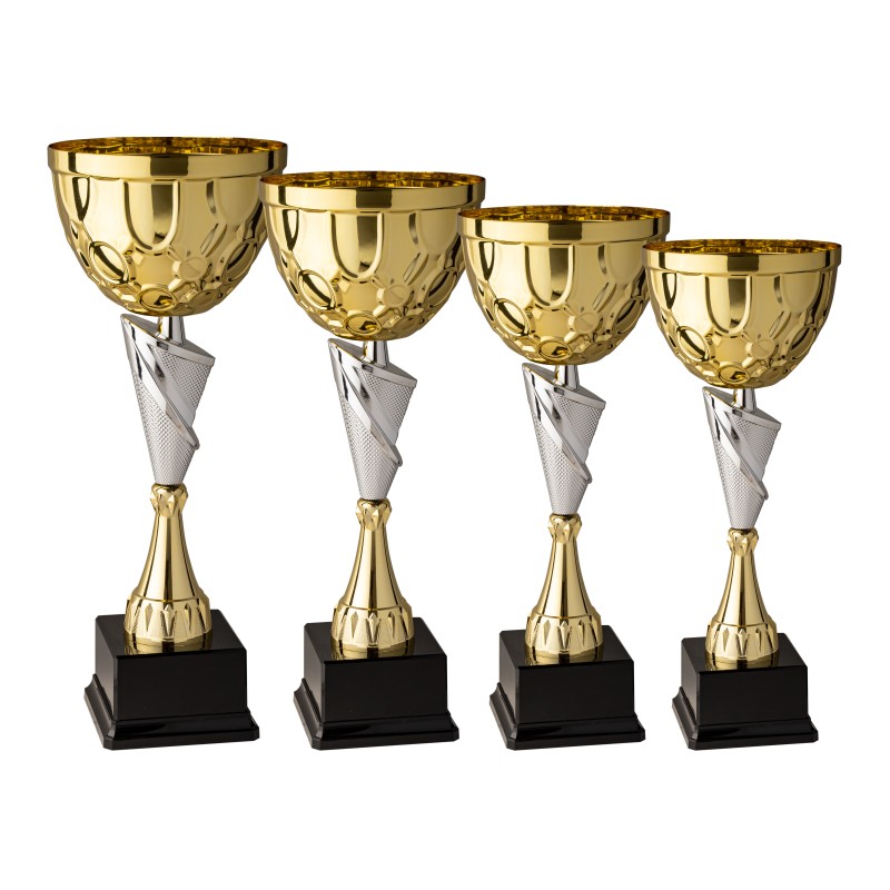 Tazza in metallo, gambo in plastica, base in plastica e resina, colore Oro. Questo trofeo non presenta soltanto un particolare elemento centrale unico e nuovissimo di forma ovale e con riporti ruvidi, ma ha anche una nuova tazza tre quarti sfera con realizzata con un stampo a forma di gocce ricorrenti e sopratutto molto attraenti, buon prodotto classico con alternanza oro argento. - Nel catalogo a pagina 8