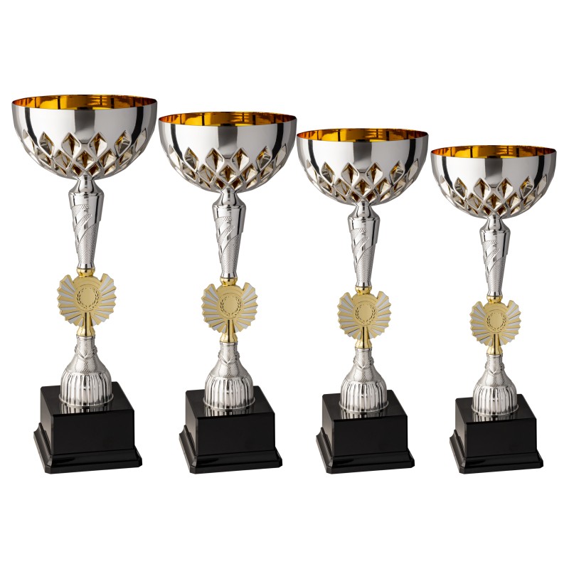 Tazza in metallo, gambo in plastica, base in plastica e resina, colore Argento. Coppa con tazza mezza sfera aperta, taglio laser molto innovativo, l'interno della tazza in oro ne impreziosisce ulteriormente il valore e la rende sostanzialmente unica nella sua categoria. - Nel catalogo a pagina 8