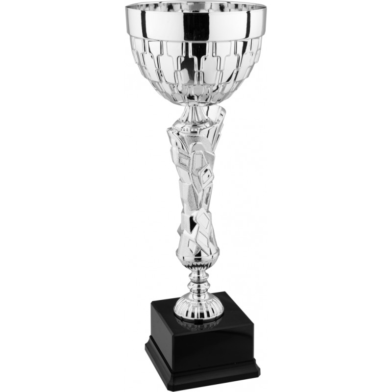 Tazza in metallo, gambo in plastica, base in plastica e resina, colore Argento. Coppa conica con tazza lavorata con disegno ricorrente molto evidente, prodotto dal design nuovo con fascia liscia uniforme nella parte superiore adatta ad ospitare eventuali adesivi personalizzati - Nel catalogo a pagina 8B
