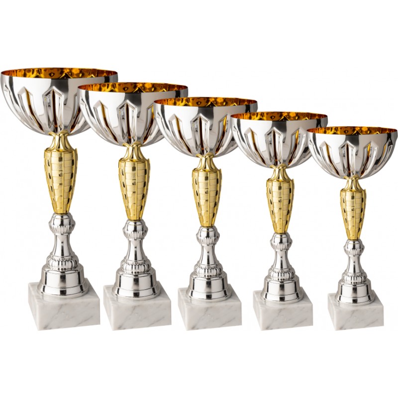 Tazza in metallo, gambo in plastica, base in marmo, colore Argento. Coppa con tazza in metallo bicolore, argento esterno e oro interno, realizzata con stampo che ne determina la traforatura verticale ricorrente. Nella collezione è uno dei prodotti economici più originali e innovativi oltre ad avere anche un gambo che utilizza componenti tutti nuovi. - Nel catalogo a pagina 10