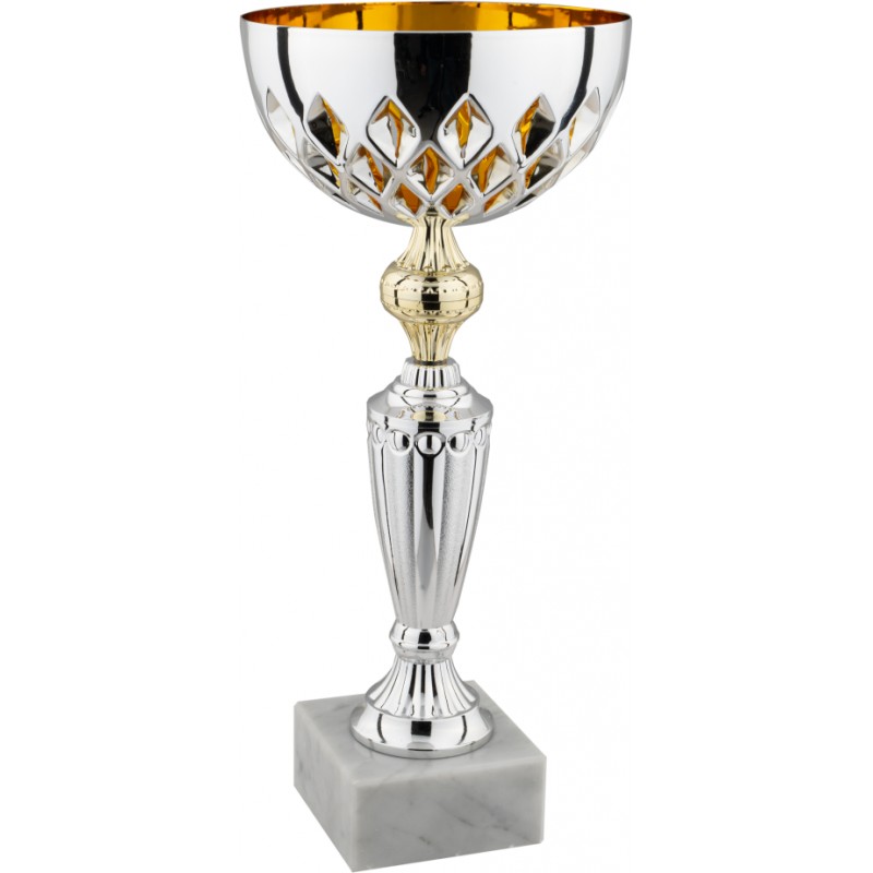 Tazza in metallo, gambo in plastica, base in marmo, colore Argento. Coppa con tazza traforata a rombo, tra i prodotti economici più originali dell'intera collezione, è molto consigliato l'utilizzo di questo modello se si vuole dare un tocco di novità alla premiazione e a tutta la manifestazione. - Nel catalogo a pagina 10