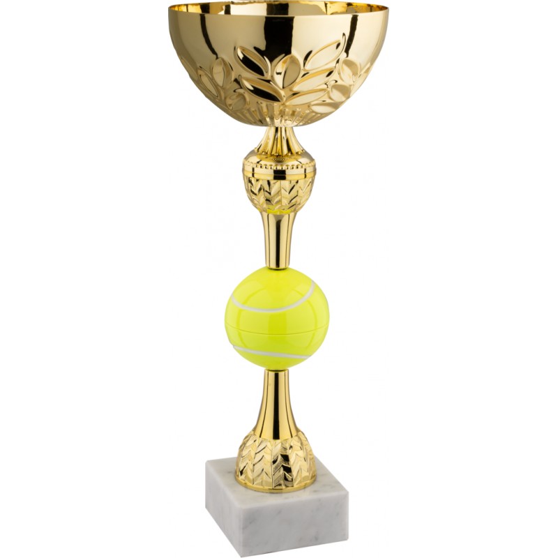 Tazza in metallo, gambo in metallo e plastica, base in marmo, colore Oro. Coppa con palla centrale in metallo bicolore dello sport specifico tennis – padel, adatta a premiazioni dove l'evidenza dello sport è elemento fortemente caratterizzante e di assoluto valore. - Nel catalogo a pagina 9