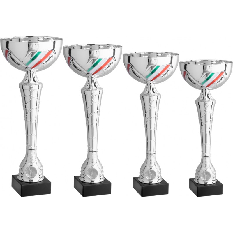 Tazza in metallo argento più tricolore italia, gambo in plastica, base in marmo nero, colore Argento. Coppa conveniente rappresentativa della migliore tradizione italiana di design, dove il vessillo tricolore viene riprodotto ripetutamente lungo la superficie delle tazza a base argentata. Altra importante novità della collezione è l'utilizzo di base in marmo di colore nero, amplificatrice dell'eleganza del prodotto. - Nel catalogo a pagina 11