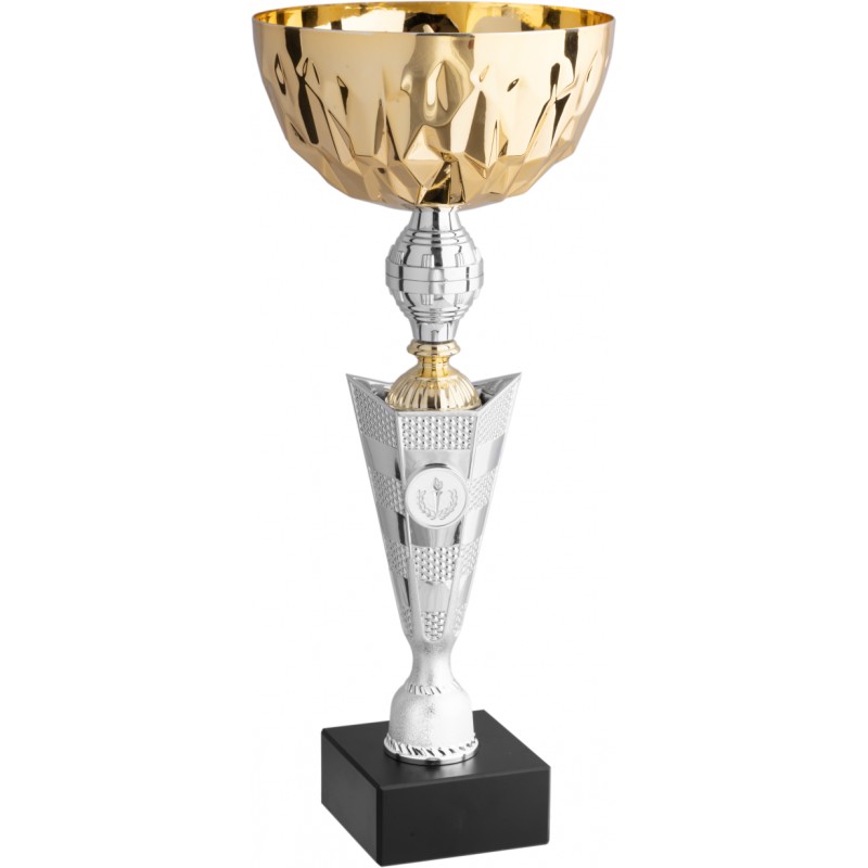 Tazza in metallo, gambo in plastica, base in marmo nero, colore Oro. Coppe di design, conveniente e assolutamente nuova nella forma e nello stile. Un premio che sarà ambito dai tanti partecipanti all'evento o dai pochi vincitori della manifestazione - Nel catalogo a pagina 11B