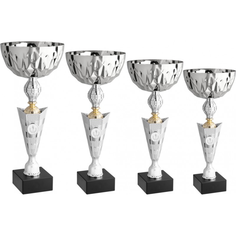 Tazza in metallo, gambo in plastica, base in marmo nero, colore Argento. Coppe di design, conveniente e assolutamente nuova nella forma e nello stile. Un premio che sarà ambito dai tanti partecipanti all'evento o dai pochi vincitori della manifestazione - Nel catalogo a pagina 11B