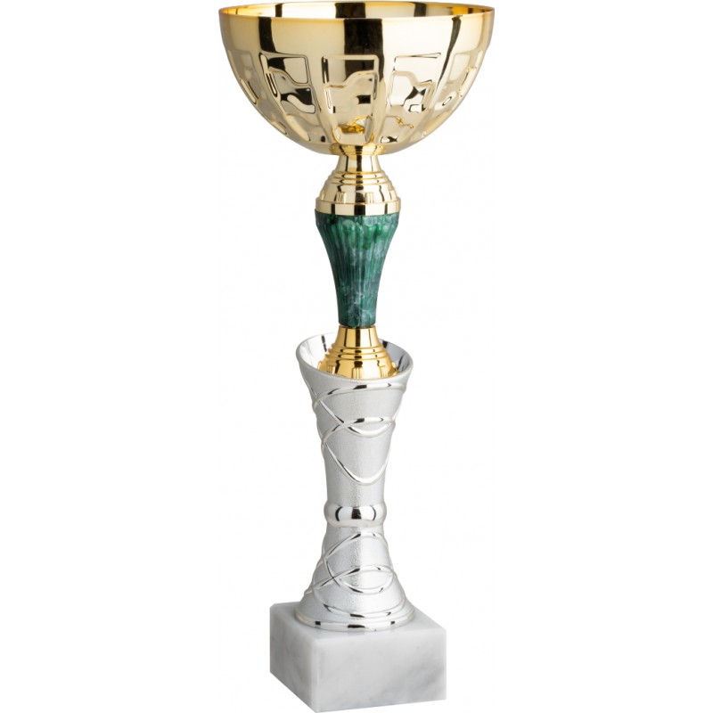 Tazza in metallo dorato, gambo in plastica argentato, verde e dorato, base in marmo bianco carrara, colore Oro. Coppa realizzata con robusto elemento argento satinato/lucido e una parte alta variegata verde, la tazza, pur essendo economica, è di massima qualità, di produzione italiana e con un design nuovo originale. - Nel catalogo a pagina 9