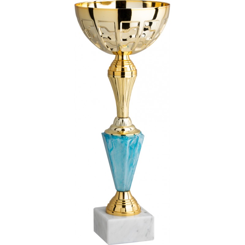 Tazza in metallo, gambo in metallo e plastica, base in marmo, colore Oro. Coppa economica caratterizzata da un primo elemento piramidale a sei facce variegato celeste e da un secondo elemento conico metallizato a colore della tazza. La robustezza del gambo rende questa coppa un prodotto particolamente importante esteticamente, richiama uno stile italiano anni 80 - Nel catalogo a pagina 9A