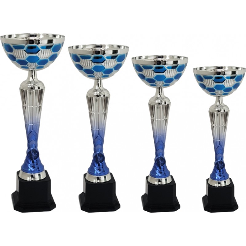 Tazza in metallo argento/blu, gambo in plastica argentato sfumato oro, base abs resina, colore Argento. Coppa con gambo monocomponete con originali sfumature blu e tazza bicolore con scacchi blu su argento. Prodotto con un valido rapporto prezzo dimensione. Con una struttura solida e slanciata, - Nel catalogo a pagina 10A