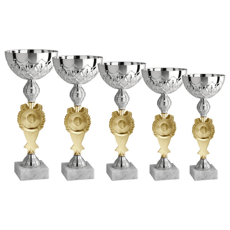 Tazza in metallo argentato, gambo in plastica argentato e dorato, base in marmo bianco carrara, colore Argento. Coppa economica ed originale con tazza e gambo assolutamente innovativi, prodotto di largo utilizzo e di classe - Nel catalogo a pagina 12