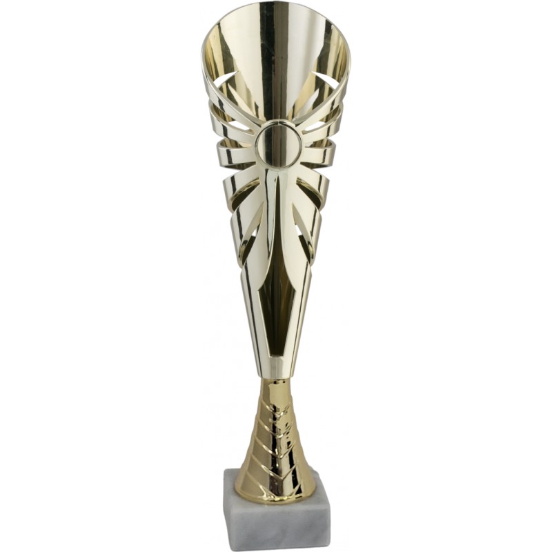 Tazza e gambo in plastica dorato, base in marmo bianco carrara, colore Oro. Coppa con tazza di stille moderno adatta anche ad ospitare eventuali adesivi raffiguranti personalizzazioni di varia natura - Nel catalogo a pagina 12C