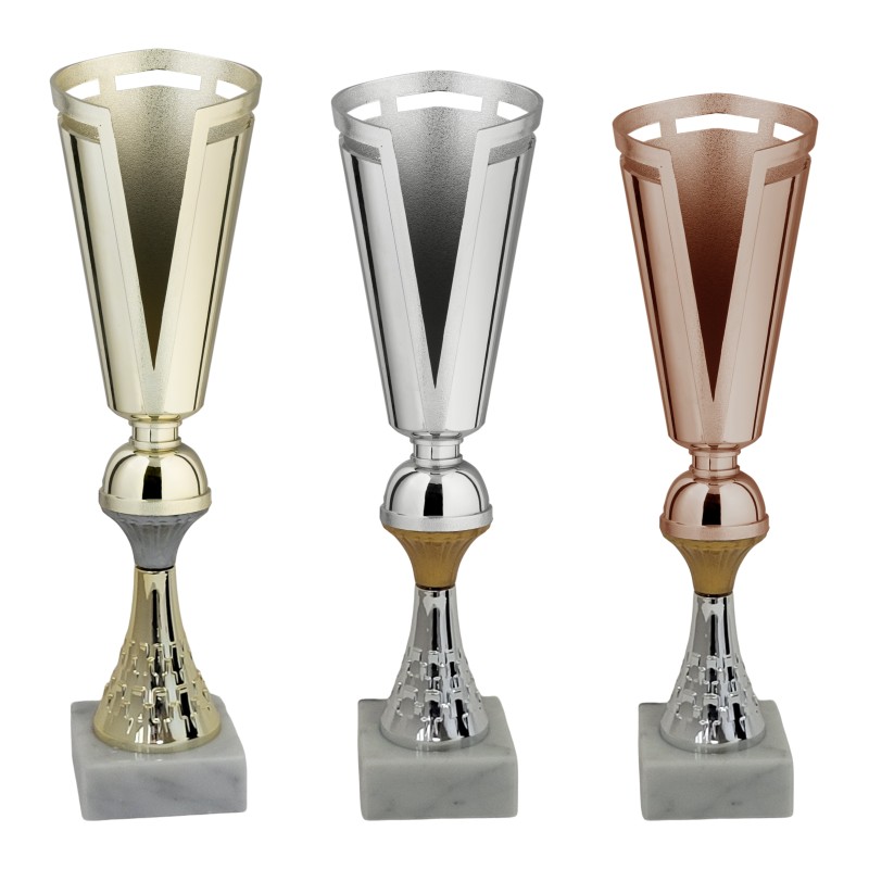 Tazza e gambo in plastica dorata per la prima misura, argentato per la seconda e bronzato per la terza, base in marmo bianco carrara, colore Oro-Argento-Bronzo. Coppa dal design innovativo proposta oltre che in più dimensione, come il caso di tutti i nostri prodotti, anche in diverse colazioni in funzione della misura richiesta - Nel catalogo a pagina 13A