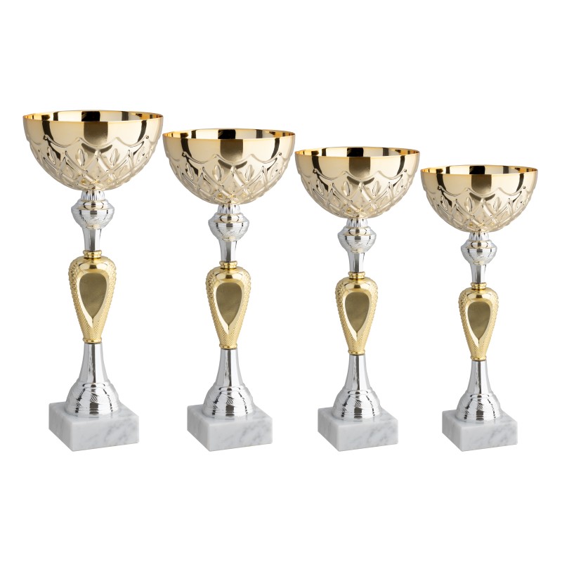 Tazza in metallo, gambo in plastica, base in marmo bianco carrara, colore Oro. Coppa con elementi tutti nuovi, dal gambo con particolare centrale molto originale, alla tazza che riporta una sequenza di scudi lungo tutta la circonferenza. Prodotto conveniente per la sua dimensione ed originale inedito. - Nel catalogo a pagina 12A