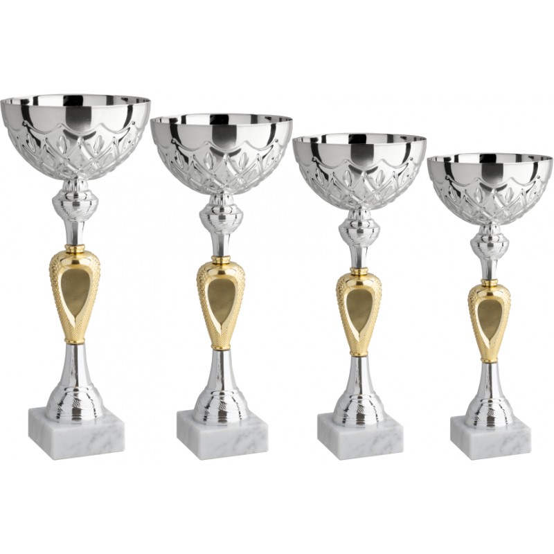 Tazza in metallo, gambo in plastica, base in marmo bianco carrara, colore Argento. Coppa con elementi tutti nuovi, dal gambo con particolare centrale molto originale, alla tazza che riporta una sequenza di scudi lungo tutta la circonferenza. Prodotto conveniente per la sua dimensione ed originale inedito. - Nel catalogo a pagina 12A