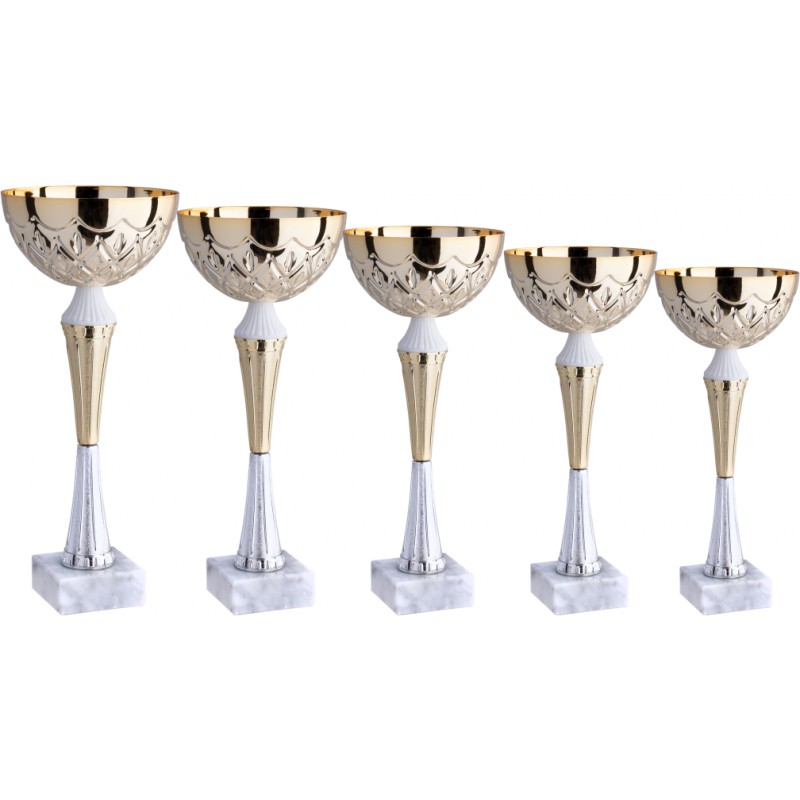 Tazza in metallo, gambo in plastica, base in marmo bianco carrara, colore Oro. Coppa dallo stile semplice e slanciato. Prodotto adatto ad essere utilizzato come premio per i vincitori o i partecipanti di gare e manifestazioni. - Nel catalogo a pagina 13