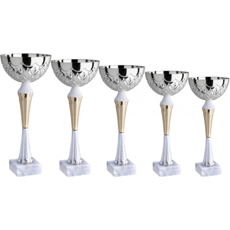 Tazza in metallo, gambo in plastica, base in marmo bianco carrara, colore Argento. Coppa dallo stile semplice e slanciato. Prodotto adatto ad essere utilizzato come premio per i vincitori o i partecipanti di gare e manifestazioni. - Nel catalogo a pagina 13
