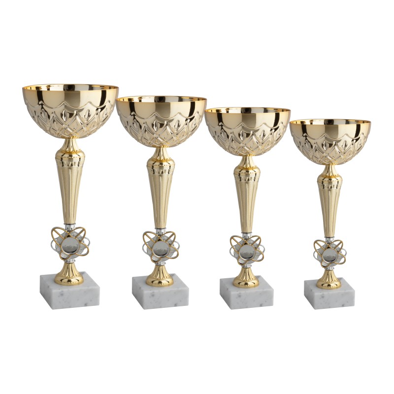 Tazza in metallo, gambo in plastica, base in marmo bianco carrara, colore Oro. Coppa moderna e conveniente, realizzata con tazza e gambo di nuovo design, caratterizzata da un elemento centrale a forma di fiore atto ad ospitare , eventualmente, un adesivo personalizzato. Il prodotto tutto metallizato è adatto per ogni tipo di gara, torneo, manifestazione o per promuovere il proprio marchio durante un evento. - Nel catalogo a pagina 13A