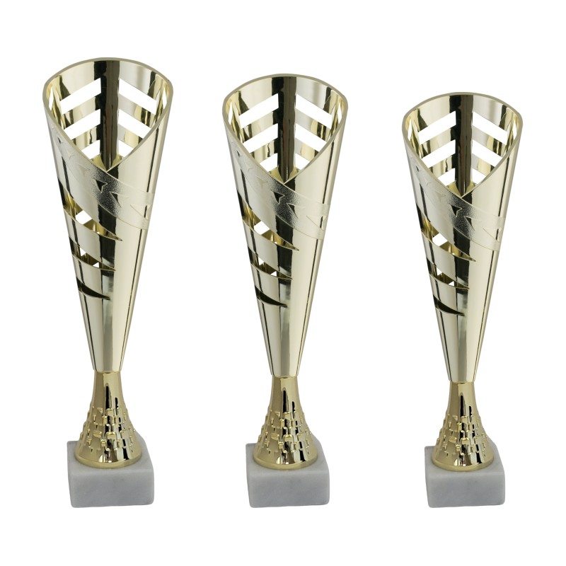 Tazza e gambo in plastica dorato, base in marmo bianco carrara, colore Oro. Coppa tipo conica allungata, molto conveniente e di ottima manifattura, adatta per premiazioni con budget contenuti - Nel catalogo a pagina 13A