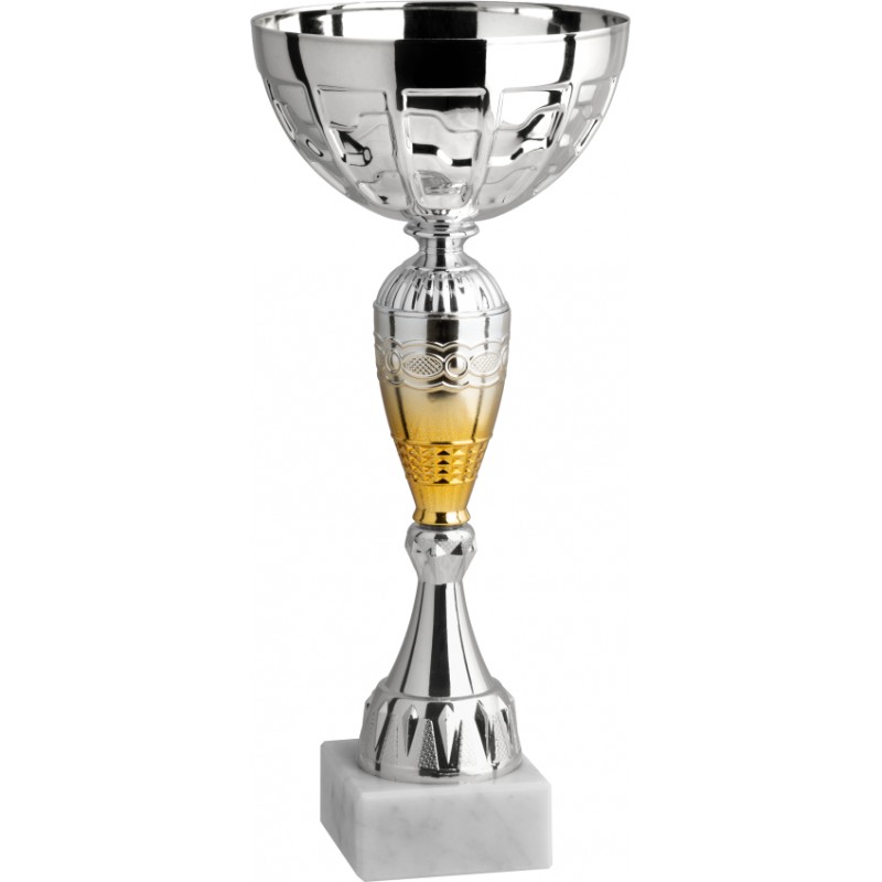 Tazza in metallo, gambo in plastica, base in marmo, colore Argento. Coppa economica con tazza prodotta in Italia e gambo oro argento con sfumatura speciale esclusiva. - Nel catalogo a pagina 12B