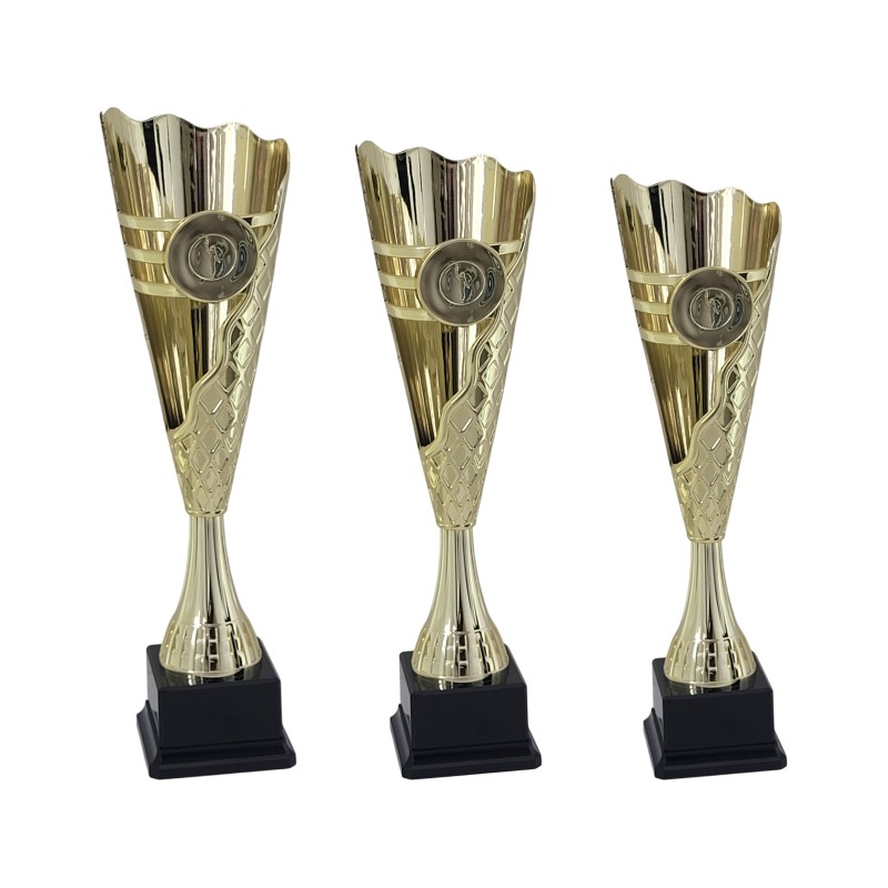 Tazza e gambo in plastica dorato, base in plastica e resina, colore Oro. Coppa molto conveniente con il massimo rapporto prezzo grandezza, dal sesign moderno, in grado di poter ospitare un adesivo personalizzato da 5 cm, monocolore metaliizata con base nera elegante - Nel catalogo a pagina 13A