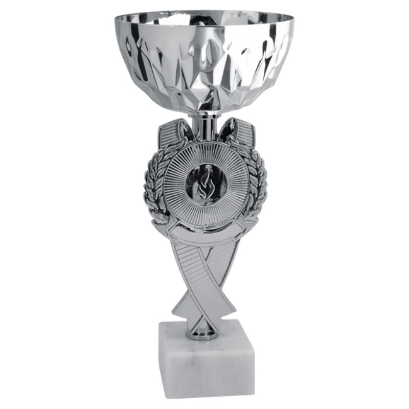 Tazza in metallo, gambo in plastica, base in marmo, colore Oro. Coppa con gambo raffigurante una coccarda che, se necessario, può ospitare un adesivo o un disco della dimensione di 25 o 50 mm. Prodotto molto conveniente e di ottima presenza, atto ad accompagnare le più qualificate cerimonie di premiazione per ogni tipo di sport, evento culturale e di rappresentanza. - Nel catalogo a pagina 13D