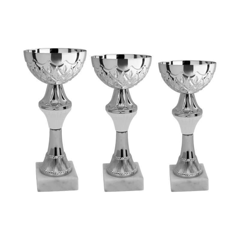 Tazza in metallo argentato, gambo in plastica argentato, base in marmo bianco carrara, colore Argento. Coppa piccola e conveniente, con particolare gambo abbinato alla bianco della base in marmo carrara. Questo piccolo prodotto è stato creato per un utilizzo all'interno di manifestazioni dove è necessario consegnare ad ogni partecipante un simbolo della propria partecipazione o vincita. - Nel catalogo a pagina 13D