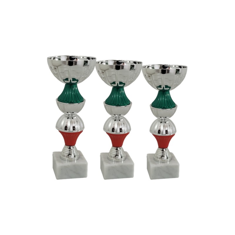 Tazza in metallo, gambo in plastica, base in marmo, colore Argento. Coppa piccola con particolari in verde e rosso e un elemento nuovo accoppiato a forma di doppia semisfera, tazza nuova di produzione italiana - Nel catalogo a pagina 13C