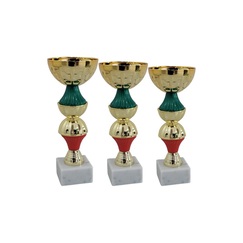 Tazza in metallo, gambo in plastica, base in marmo, colore Oro. Coppa piccola con particolari in verde e rosso e un elemento nuovo accoppiato a forma di doppia semisfera, tazza nuova di produzione italiana - Nel catalogo a pagina 13C
