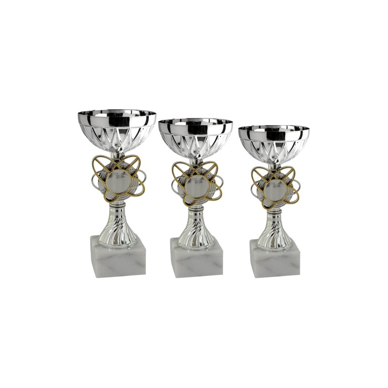 Tazza in metallo, gambo in plastica, base in marmo, colore Argento. Coppa piccola con gambo argento con riporti oro, con spazio per logo, tazza di produzione italiana di ottima qualità, prodotto molto conveniente. - Nel catalogo a pagina 13C