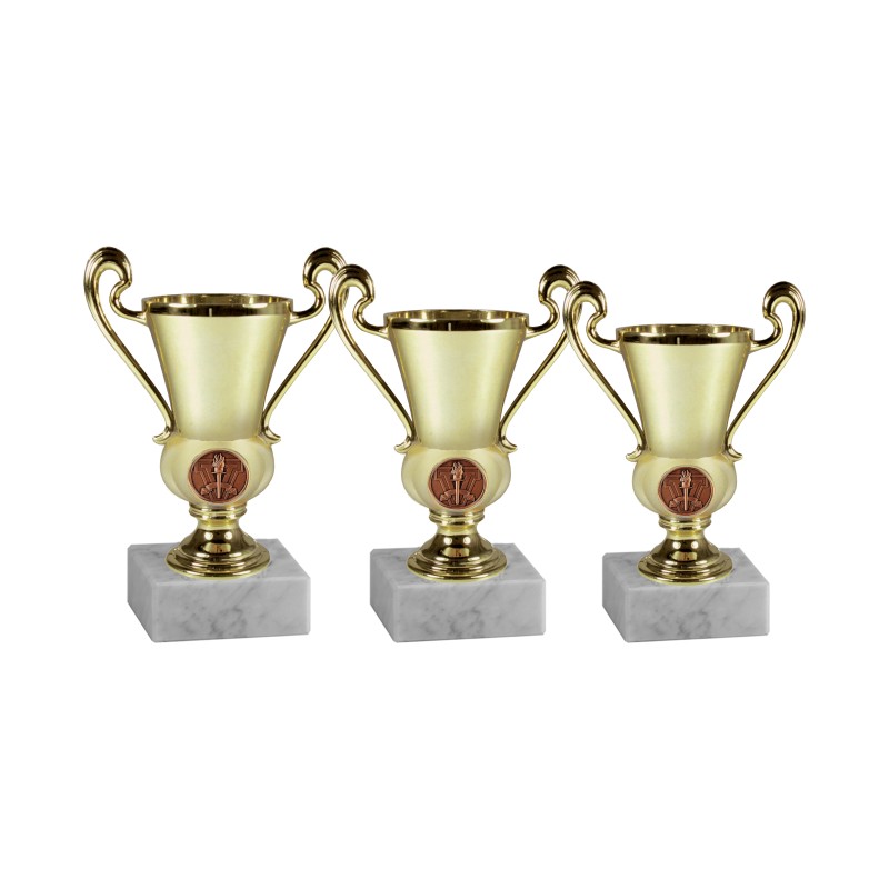 Tazza e gambo in plastica, base in marmo, colore Oro. Mini coppa color oro con forma simpatica e classica, manici affusolati ed elemento centrale fiaccola, Può ospitare dischi e adesivi diametro 25 mm, codice per acquisti di minimo 6 pz - Nel catalogo a pagina 13B