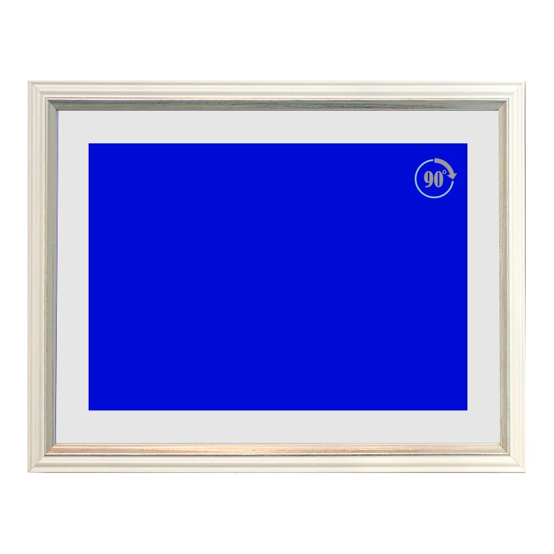 Cornice in legno bianco e argento con passpartout cartoncino bianco e cartoncino blu, colore Bianco. Cornice in legno fornita con cartoncino e passpartout atto ad ospitare targhe, pergamene o altro, completa di vetro spessore 2 mm, schienale in mdf, ganci in orizzontale e verticale - Nel catalogo a pagina 21